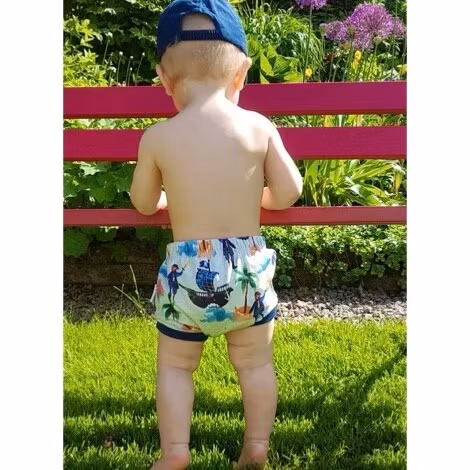 För de minsta barnen är denna shortsbyxan perfekt att ha över blöjan. Sys med resår eller mudd i midjan och har mudd vid benslut.