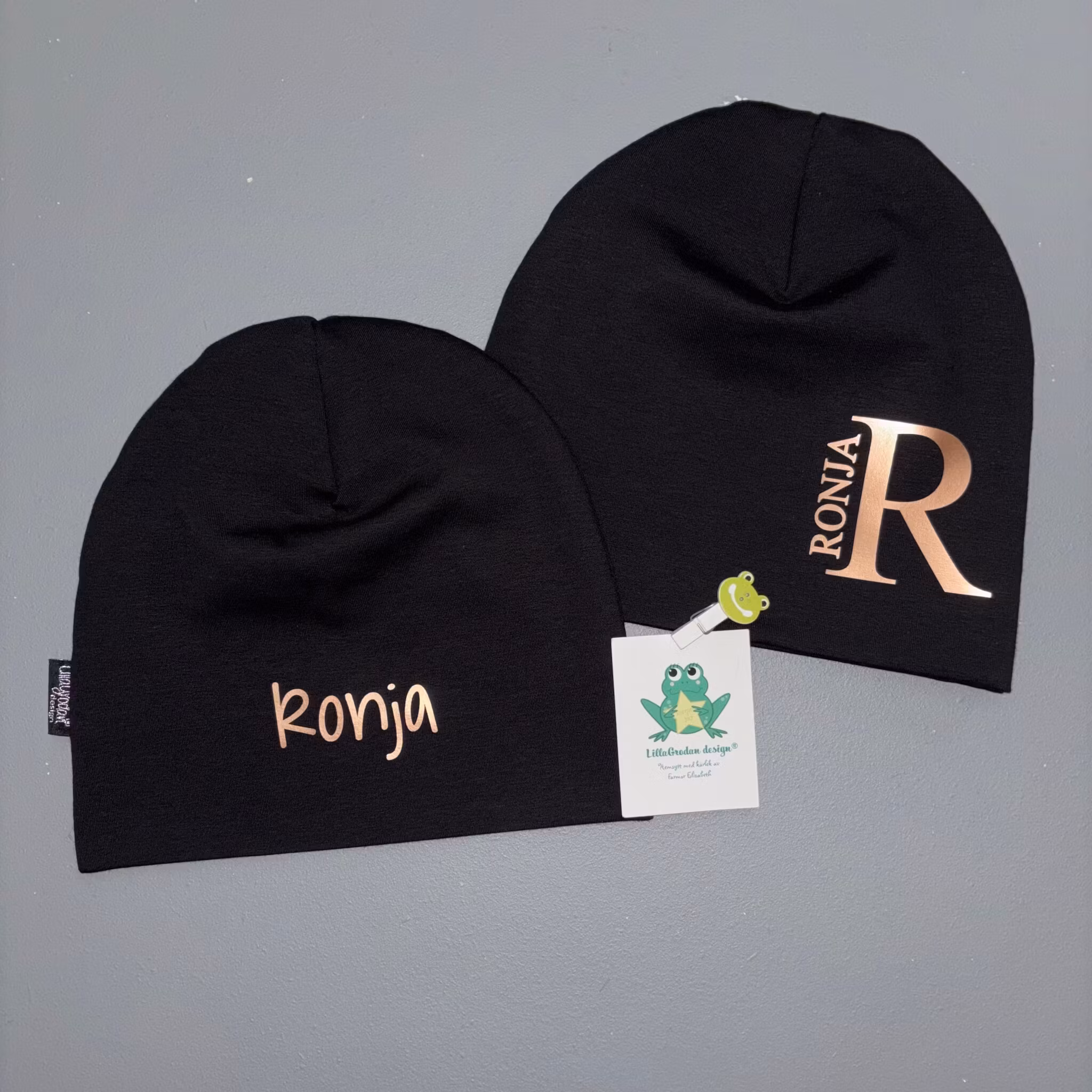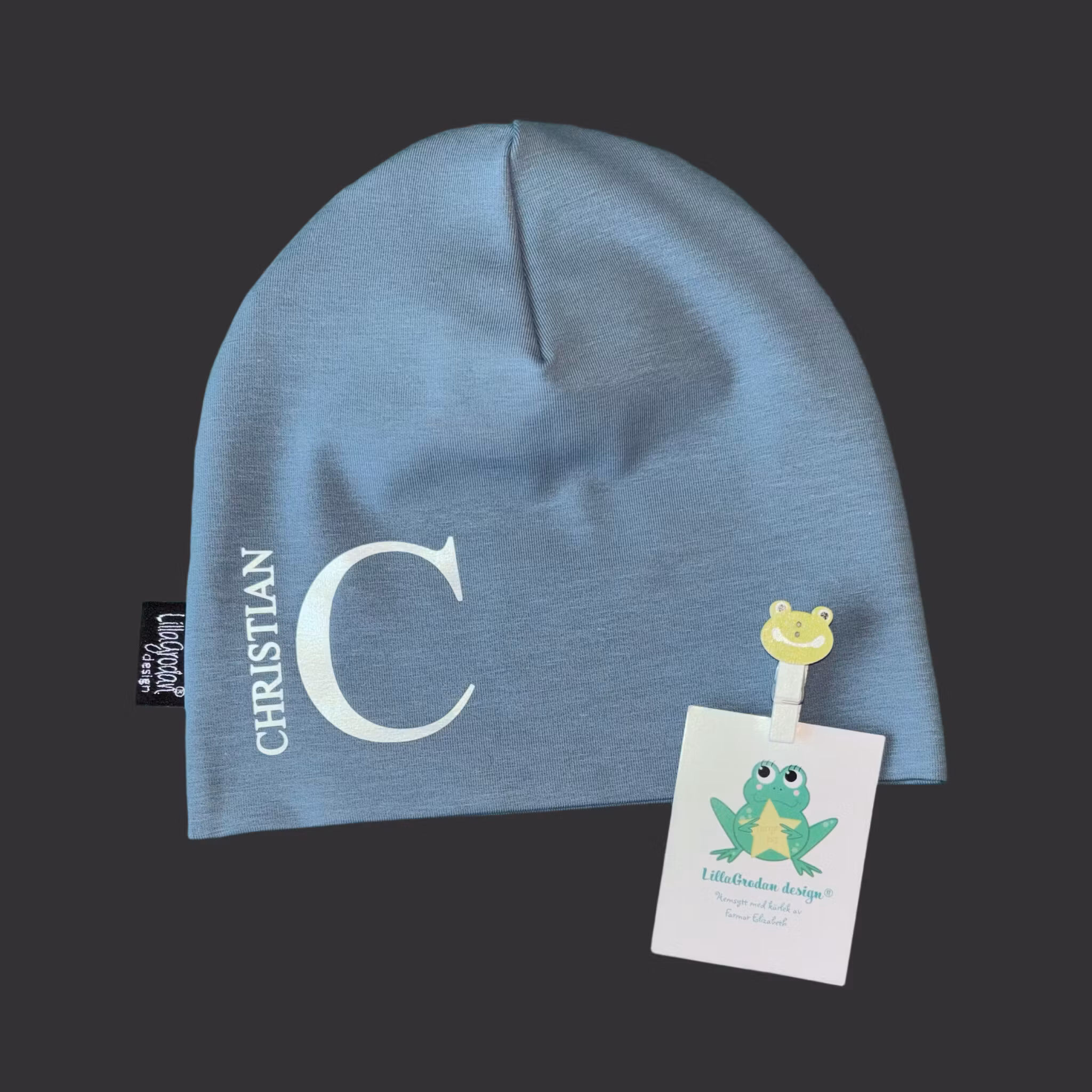 Mössa med vinyltryckt bokstav + namn. Motivet anpassas efter mössans storlek. Mössan sys efter huvudstorlek. Tips på hur man tar huvudmått finns HÄR