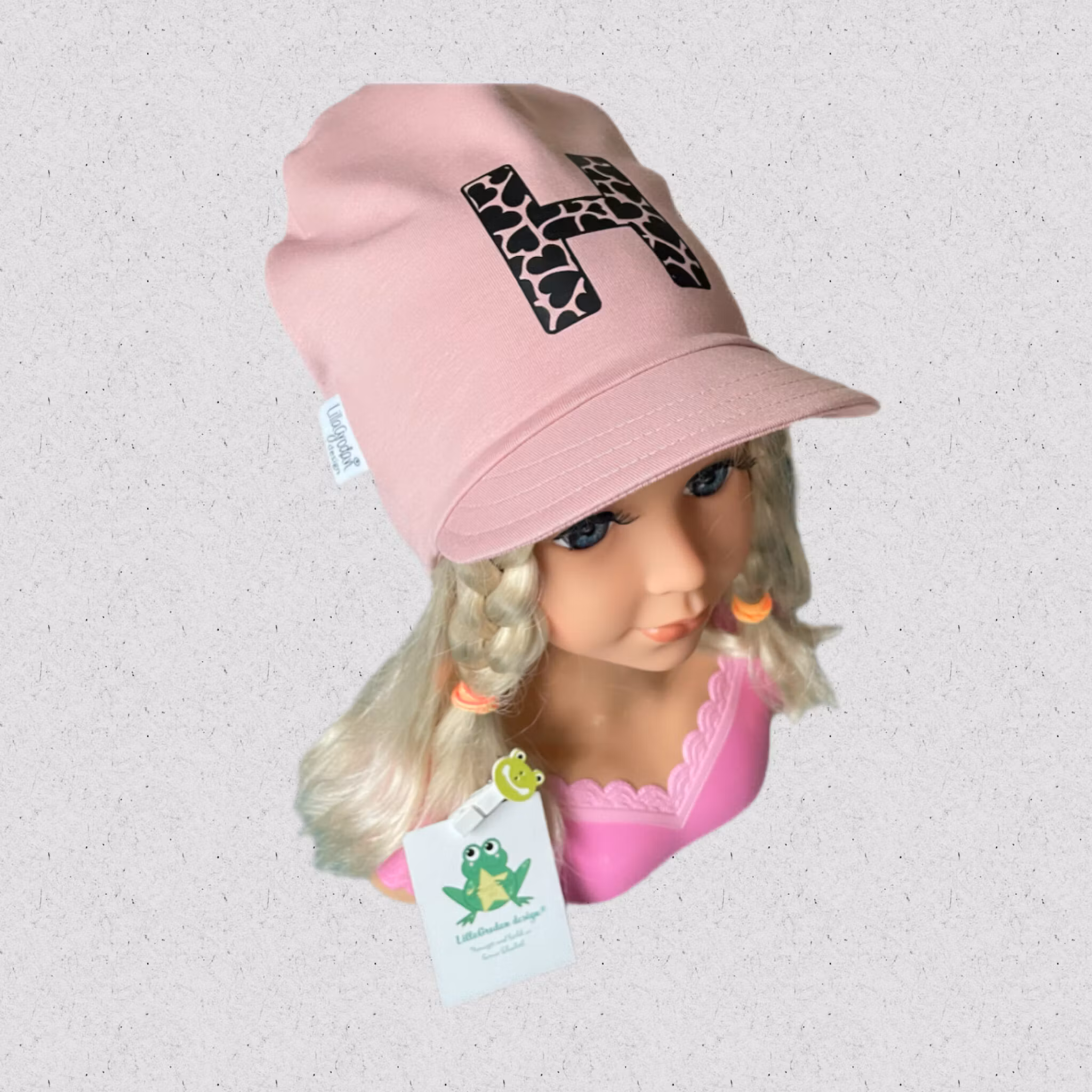 Mössa med bokstavstryck. Typsnitten är ca 4-5 cm höga i strl 38/40-46/48 och ca 7 cm i strl 50/52-58/60.
