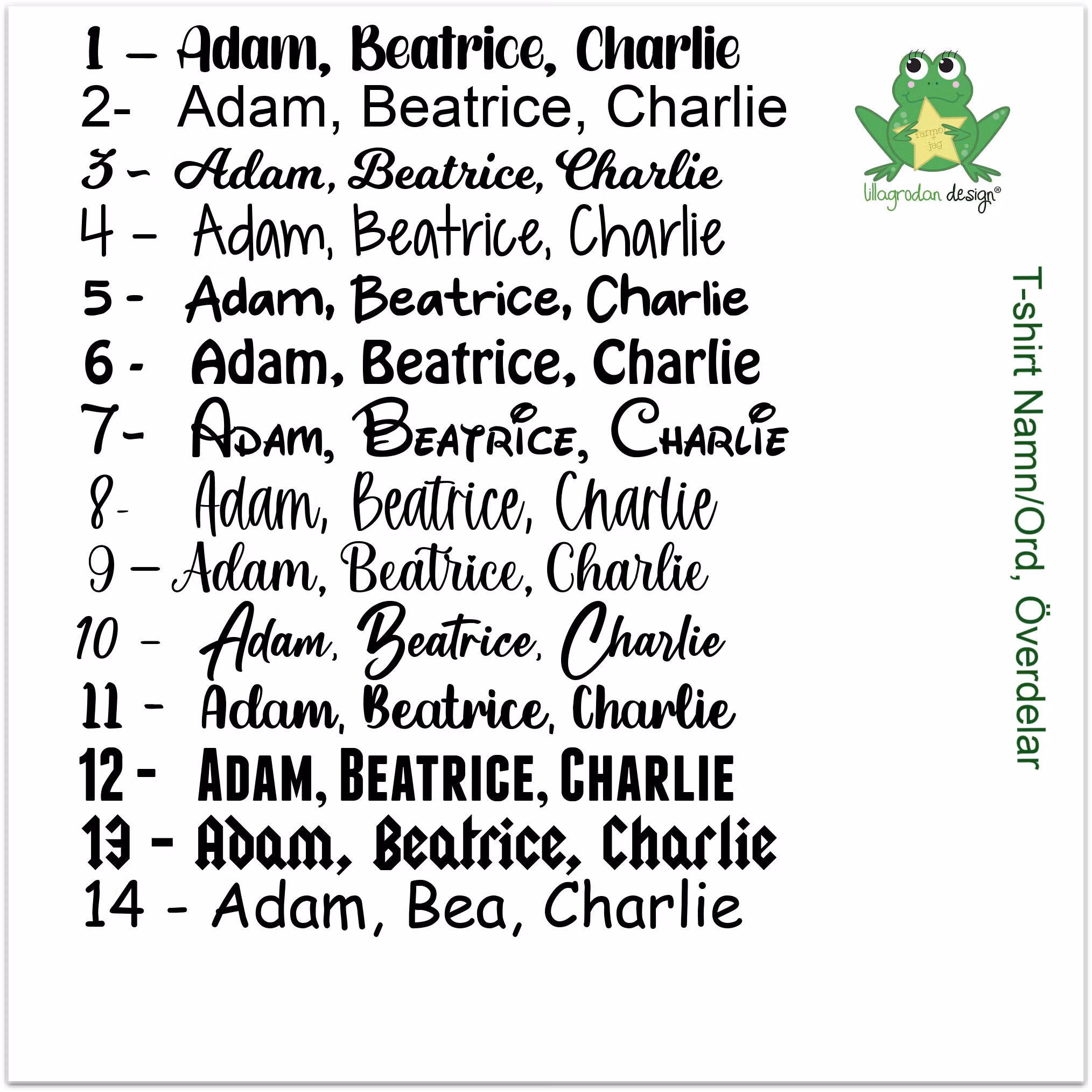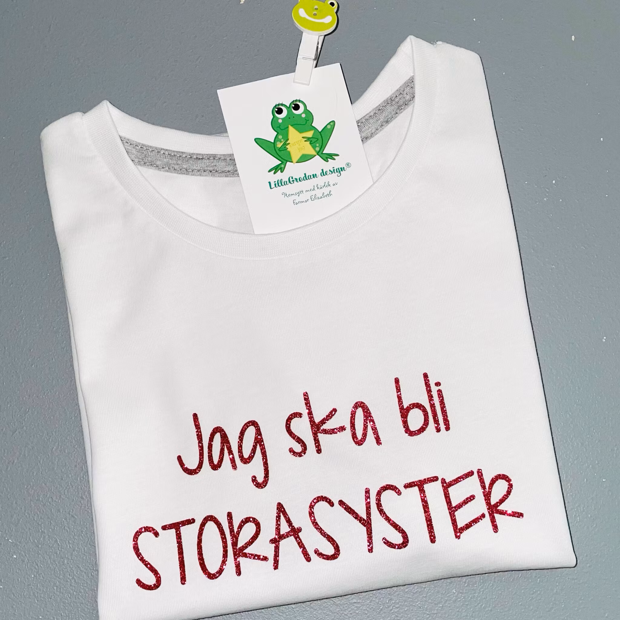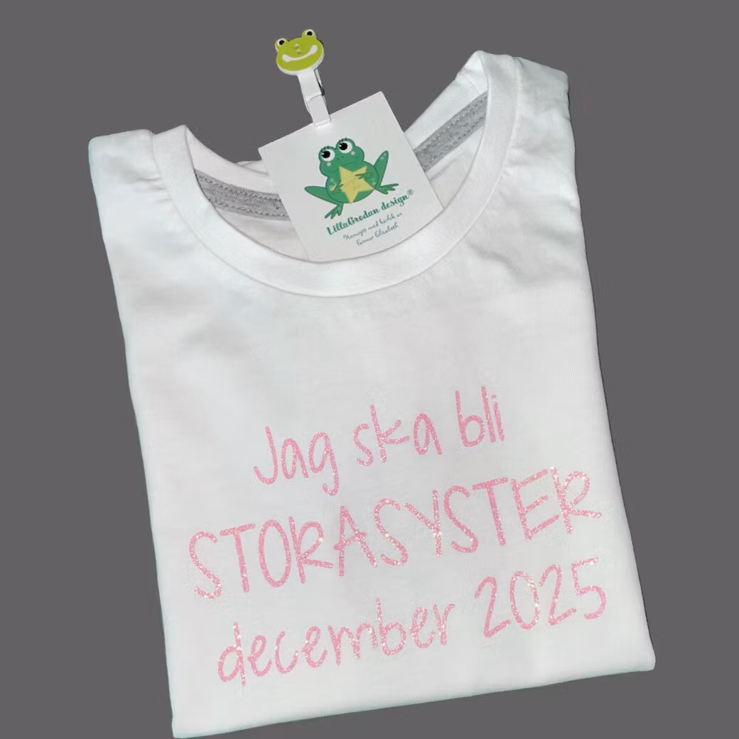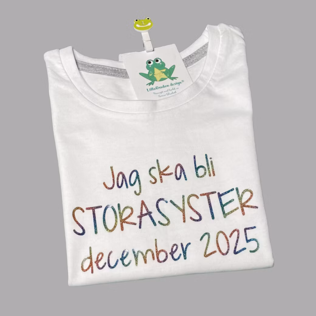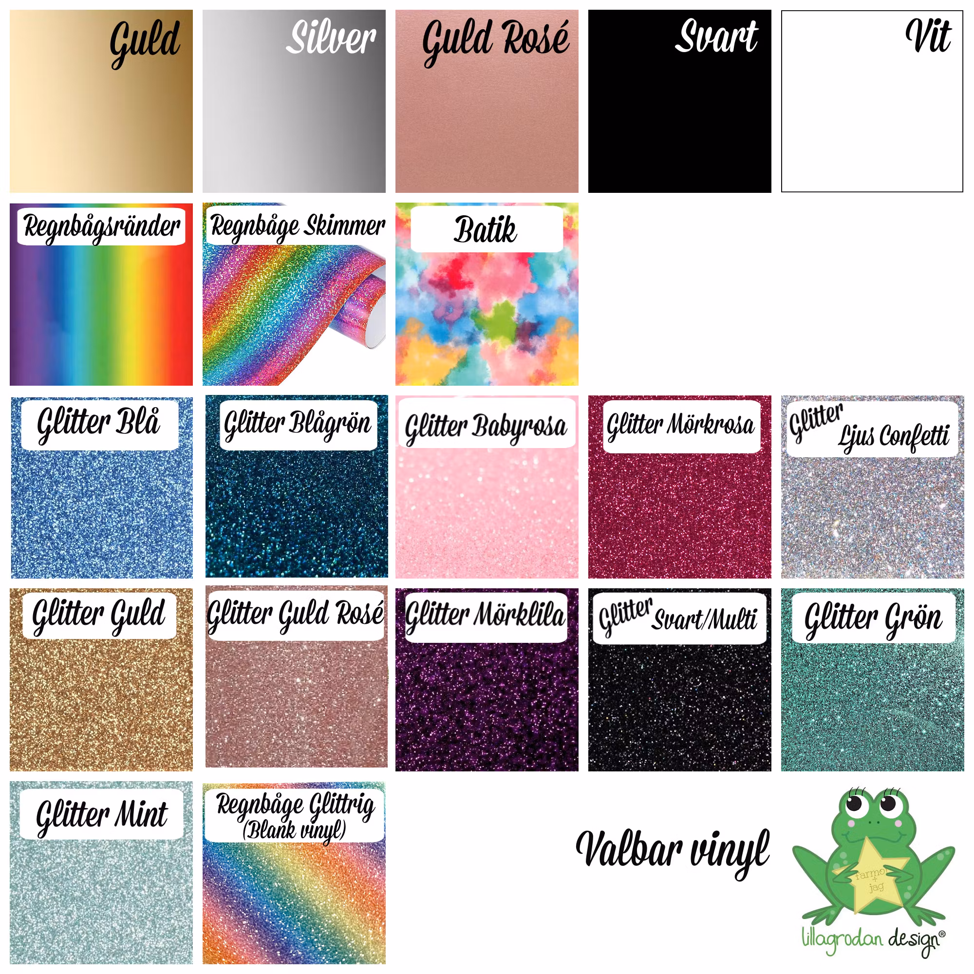 Kortärmad T-shirt med vinyltryck i valfri färg. Singeljersey i ökotexmärkt 100% bomull, 160 g/m2, kontrastband bak i nacken, smal ribbad halsmudd. Vinyl av polyuretan, märkt Oeko-Tex 100, glittervinyl certifierad enligt CPSIA Certified, vilket innebär att den är ofarlig för barnkläder.