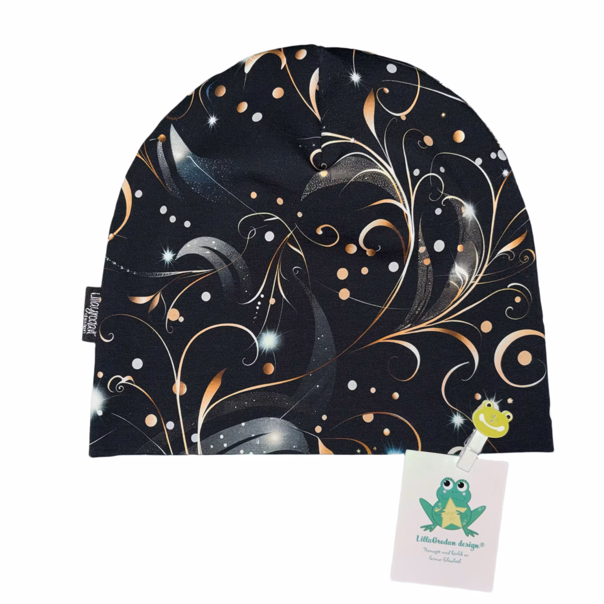 Dubbelsydd mössa i tyg Elegans, Svart/Guld. Huvudstrl 54/56.