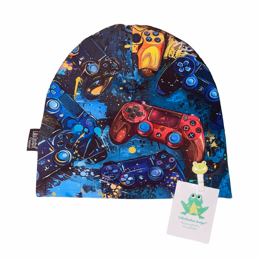Dubbelsydd mössa i tyg Gamer, Blå. Huvudstorlek 54/56