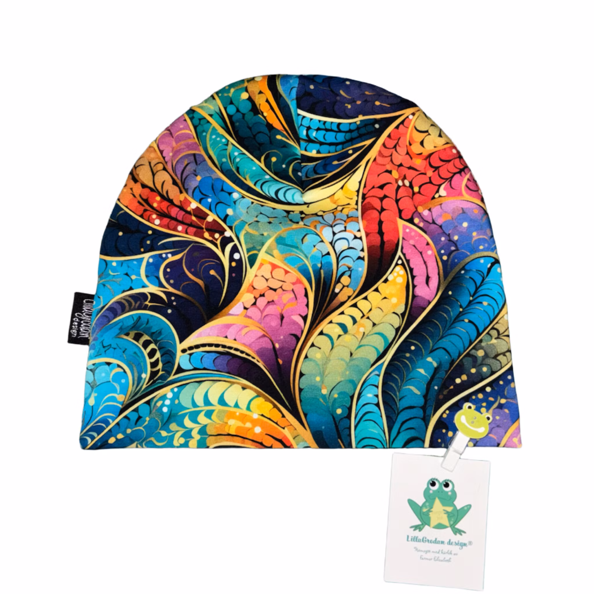 Dubbelsydd mössa i tyg Virvlar, Regnbågsfärg. Huvudstrl 54/56.